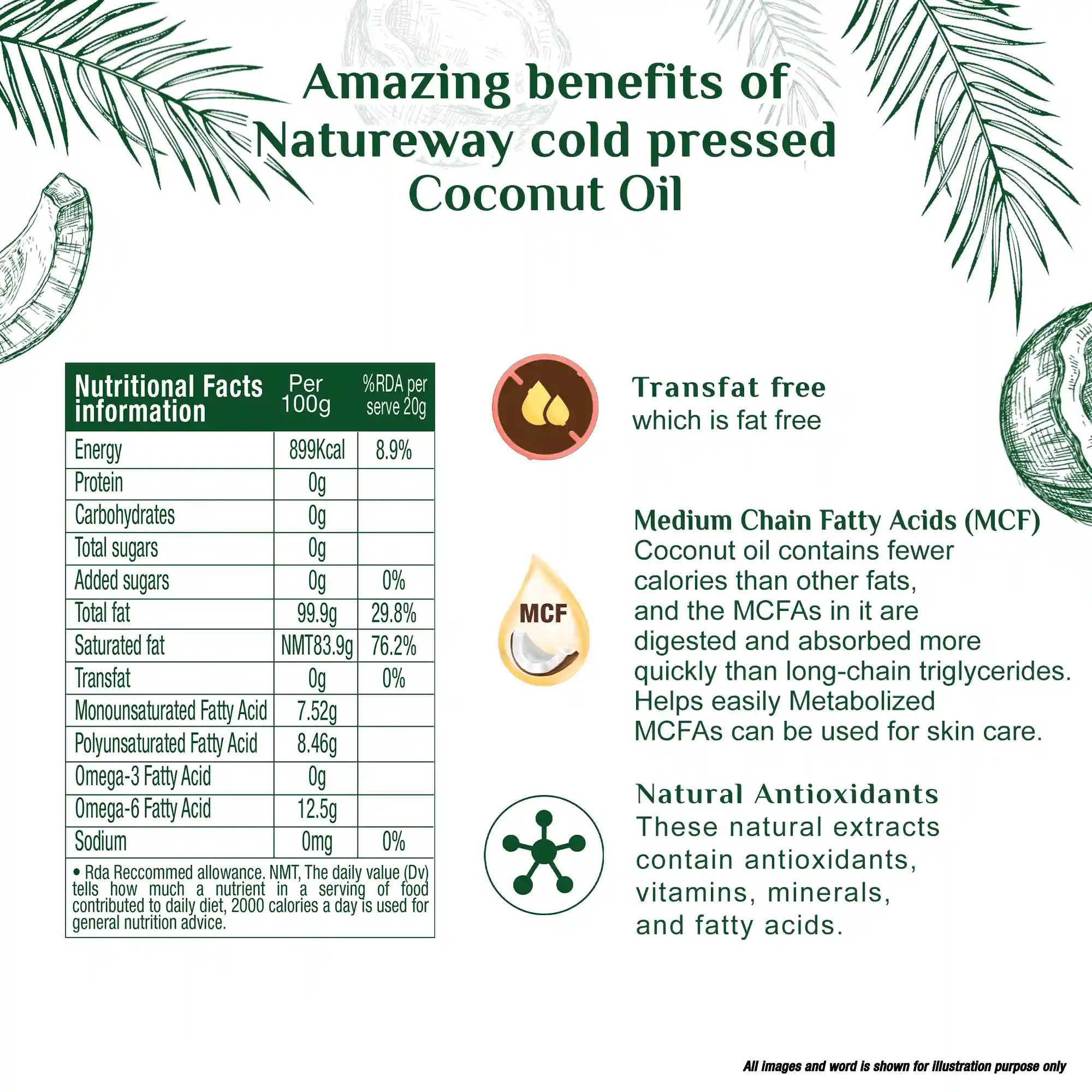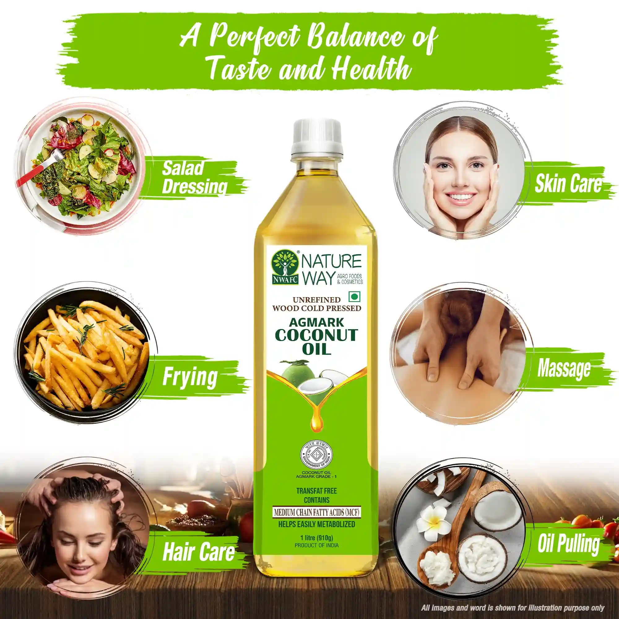 Cooking: Ideal for frying, sautéing, and baking; adds mild flavour, boosts energy, and supports metabolism.